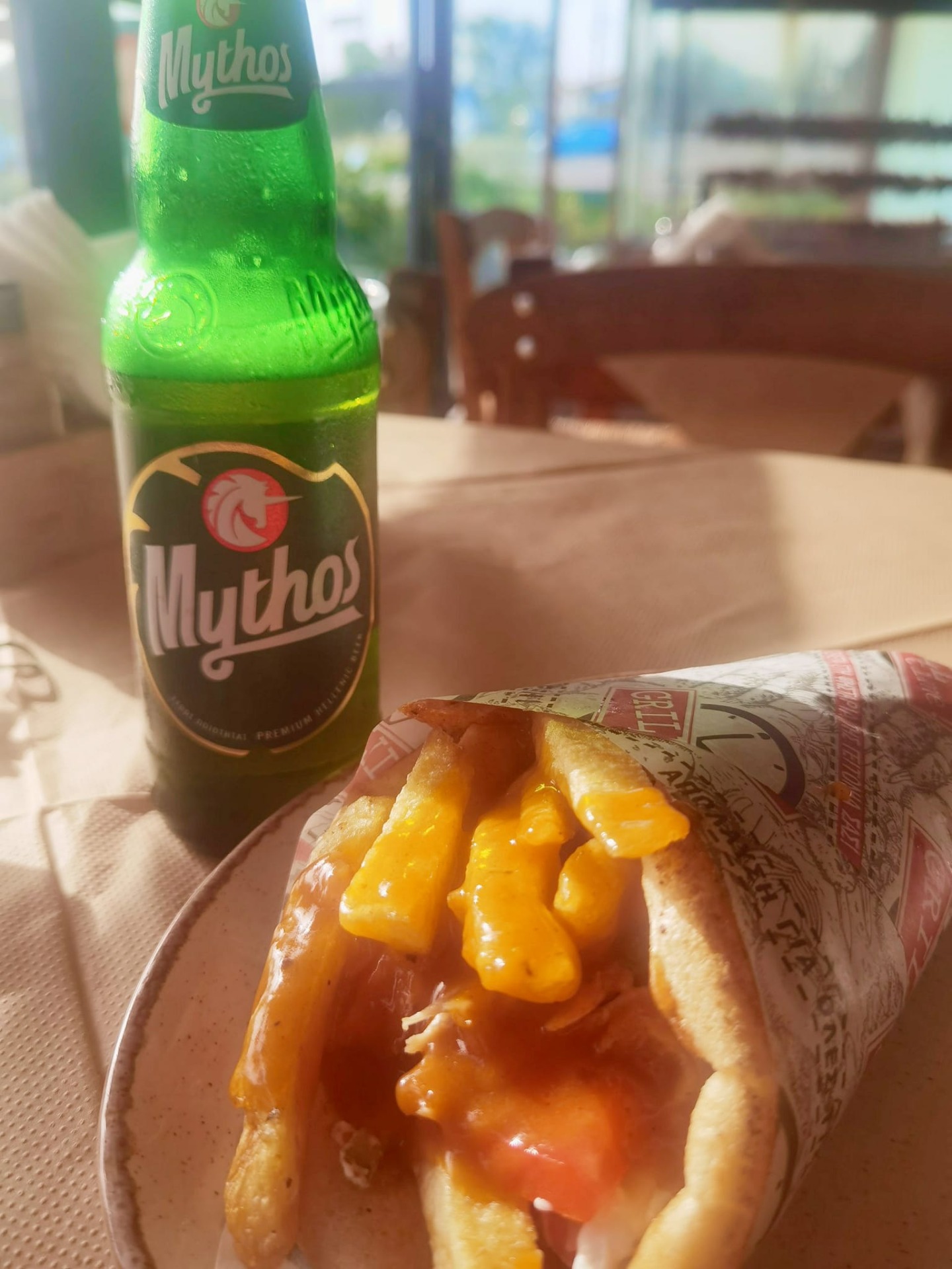 Cestou z Corfu town na sever jsem se zastavila za Gouvií, v jedné taverně hned u silnice. Dala jsem si kuřecí pitu s hranolky, rajčaty, tzatziky, a ještě asi něčím a k tomu pivo. Fotka není nic moc, chtěla jsem to vyfotit ještě líp, ale měla jsem dost hlad, bylo to v 7 večer moje první jídlo. Mythos ujde, dostala jsem sice skleničku, ale nějak se mi nezdála, tak jsem pivo pila z lahve, nevypila jsem ho celý, protože mne ještě čekala cesta a protože jen na za pití dobrý. Jinak tady na ostrově se může asi tak jedno velký, když řídíte. Za oboje jsem dala 6,50 eur a bylo to mňam, je to vyhlášené místo i když prostředí je jako u nás v bufáči na stojáka. Uvnitř seděl jeden pár a u dalšího stolu dva muži a u dalšího stolu já a musím říct, že jsem si užívala tý svobody po Africe, kdy tam není úplně tak klidný, když si jde žena jen tak někam sama, natož aby pila pivo z lahve. A pokud na mne tady někdo podezřele koukal, bylo mi to popravdě úplně jedno.